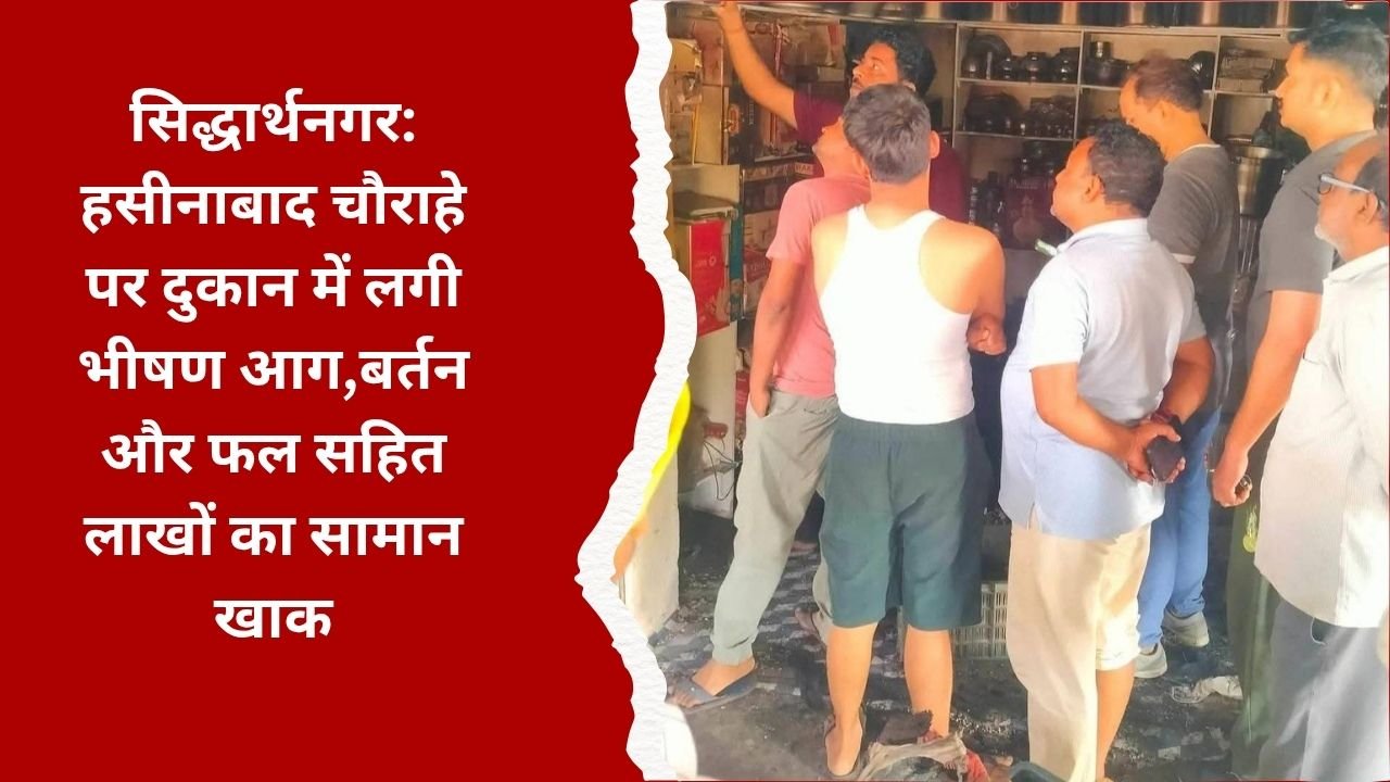 सिद्धार्थनगर: हसीनाबाद चौराहे पर दुकान में लगी भीषण आग,बर्तन और फल सहित लाखों का सामान खाक