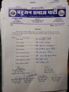बसपा की राष्ट्रीय अध्यक्ष मायावती के निर्देश पर मुख्य जोन प्रभारी इंदल राम ने राजकुमार आर्या को दोबारा जिलाध्यक्ष मनोनीत किया है। उन्होंने जिला उपाध्यक्ष पद पर शमीम अहमद महासचिव मुनीराम राजभर व कोषाध्यक्ष पद पर आलोक तिवारी जिला कार्यकणनी रामधनी गौतम व सुजीत कुमार को बनाया गया बी. वी. एफ. रतनसागर व बामसेफ जितेन्द्र कुमार को जिम्मेदारी मिली