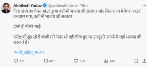 समाजवादी पार्टी के मुखिया अखिलेश यादव ने पेपर लिक मामले में योगी सरकार को घेरते हुए सोशल मीडिया एक्स पर पोस्ट किया है,