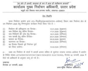 उत्तर प्रदेश के अयोध्या जिले की मिल्कीपुर सीट पर होने वाले उपचुनाव को लेकर चुनाव आयोग ने औपचारिक घोषणा कर दी है। यह सीट पिछले साल जून से खाली पड़ी थी और अब अंततः 5 फरवरी को मतदान होगा, जबकि नतीजे 8 फरवरी को घोषित किए जाएंगे।