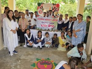 अवंतिका, जन्नत, महक और लक्ष्मी जैसी छात्राओं के समूह ने रंगोली के माध्यम से बालिका शिक्षा और महिला सशक्तिकरण का प्रभावशाली संदेश दिया।