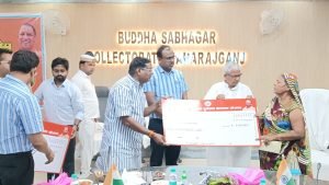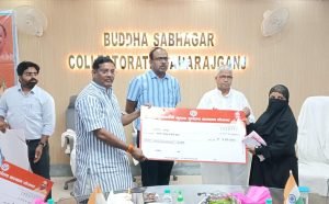 महराजगंज जनपद के कलेक्ट्रेट सभागार में आज मुख्यमंत्री कृषक दुर्घटना कल्याण योजना के अंतर्गत 82 लाभार्थी परिवारों को 5-5 लाख रुपये की सहायता राशि के चेक वितरित किए गए। इस महत्वपूर्ण कार्यक्रम में सदर विधायक जयमंगल कन्नौजिया और पनियरा विधायक ज्ञानेंद्र सिंह मुख्य रूप से उपस्थित रहे, जिन्होंने कुछ लाभार्थियों को चेक प्रदान किए।