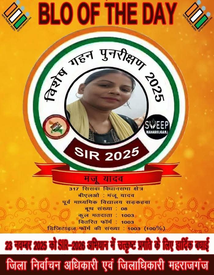 महराजगंज जनपद के निचलौल ब्लॉक की सबसे बड़ी ग्रामसभा ठूठीबारी में चल रहे मतदाता पुनरीक्षण अभियान में भाग संख्या आठ ने पूरे जिले में सबसे बेहतर प्रदर्शन किया है। बीएलओ मंजू यादव ने सुपरवाइजर मनीष पटेल के कुशल मार्गदर्शन में 1003 मतदाताओं का गणना प्रपत्र कार्य पूर्ण कर यह बड़ी उपलब्धि हासिल की है।