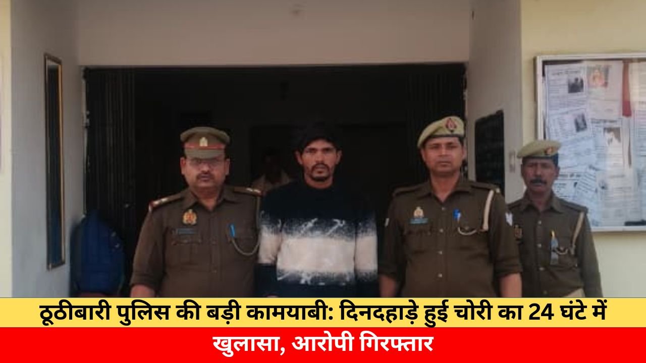 महराजगंज जनपद के ठूठीबारी थाना क्षेत्र के ग्रामसभा राजाबारी (टोला पड़ियाताल) में दिनदहाड़े हुई चोरी की सनसनीखेज वारदात का पुलिस ने महज एक दिन के भीतर खुलासा कर दिया है। कोतवाली प्रभारी नवनीत नागर के नेतृत्व में पुलिस ने आरोपी को गिरफ्तार कर चोरी का शत-प्रतिशत सामान बरामद कर लिया है।