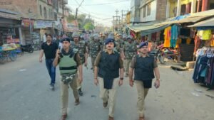 फ्लैग मार्च: भारी पुलिस बल के साथ कस्बे के प्रमुख मार्गों पर रूट मार्च निकाला गया।