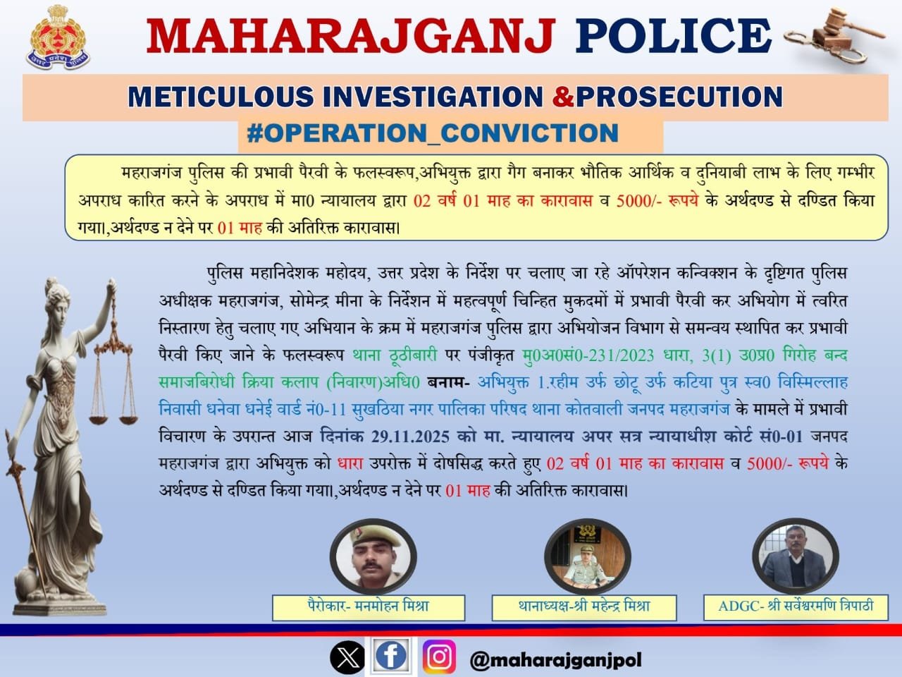 ‘ऑपरेशन कन्विक्शन’ का असर महराजगंज कोर्ट ने गैंगेस्टर को सुनाई 2 साल 1 महीने की सज़ा November 30, 2025