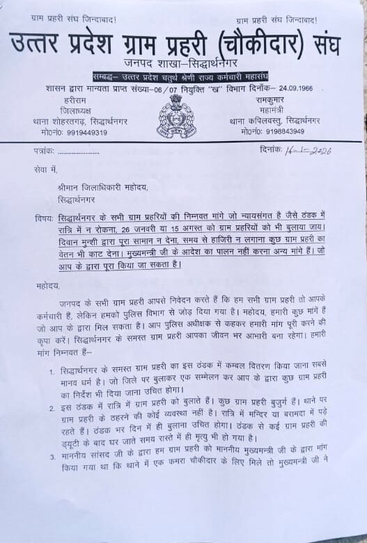सिद्धार्थनगर: वेतन वृद्धि और सुविधाओं की मांग को लेकर चौकीदार प्रहरी संघ ने जिलाधिकारी को सौंपा ज्ञापन January 16, 2026